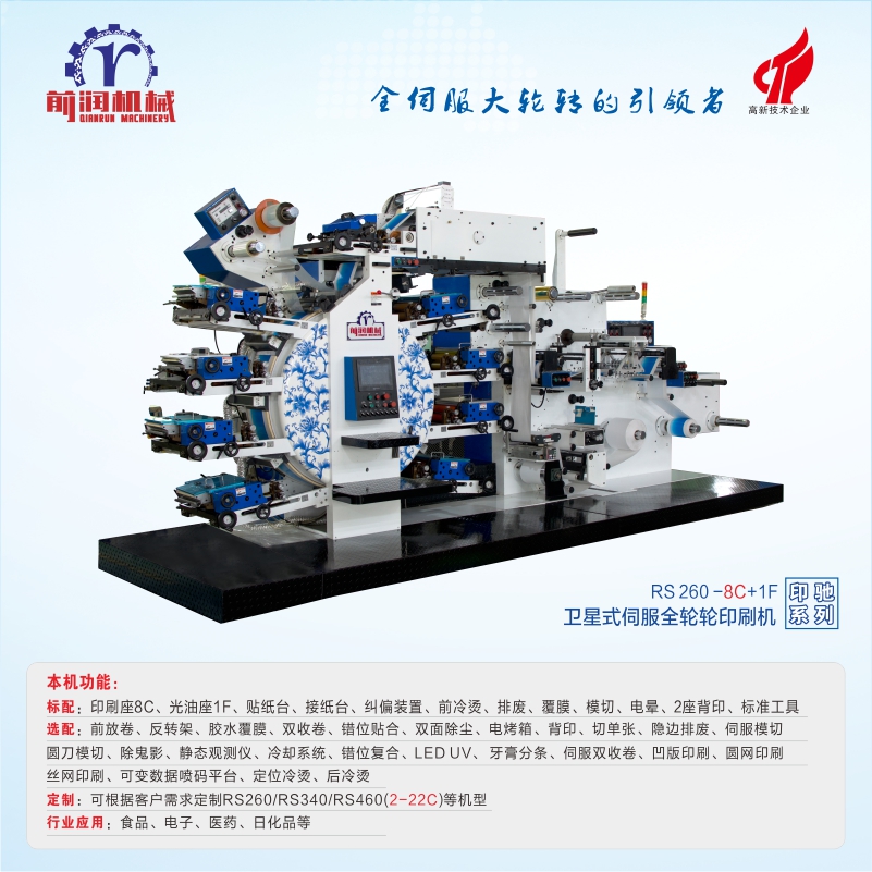 1.Compared with common label printing machines, RS260-8C+1F can reach a high speed of 100M/min andl with more precise positioning and more accurate color printing.  Advanced ink distribution ensures more even coloring.
