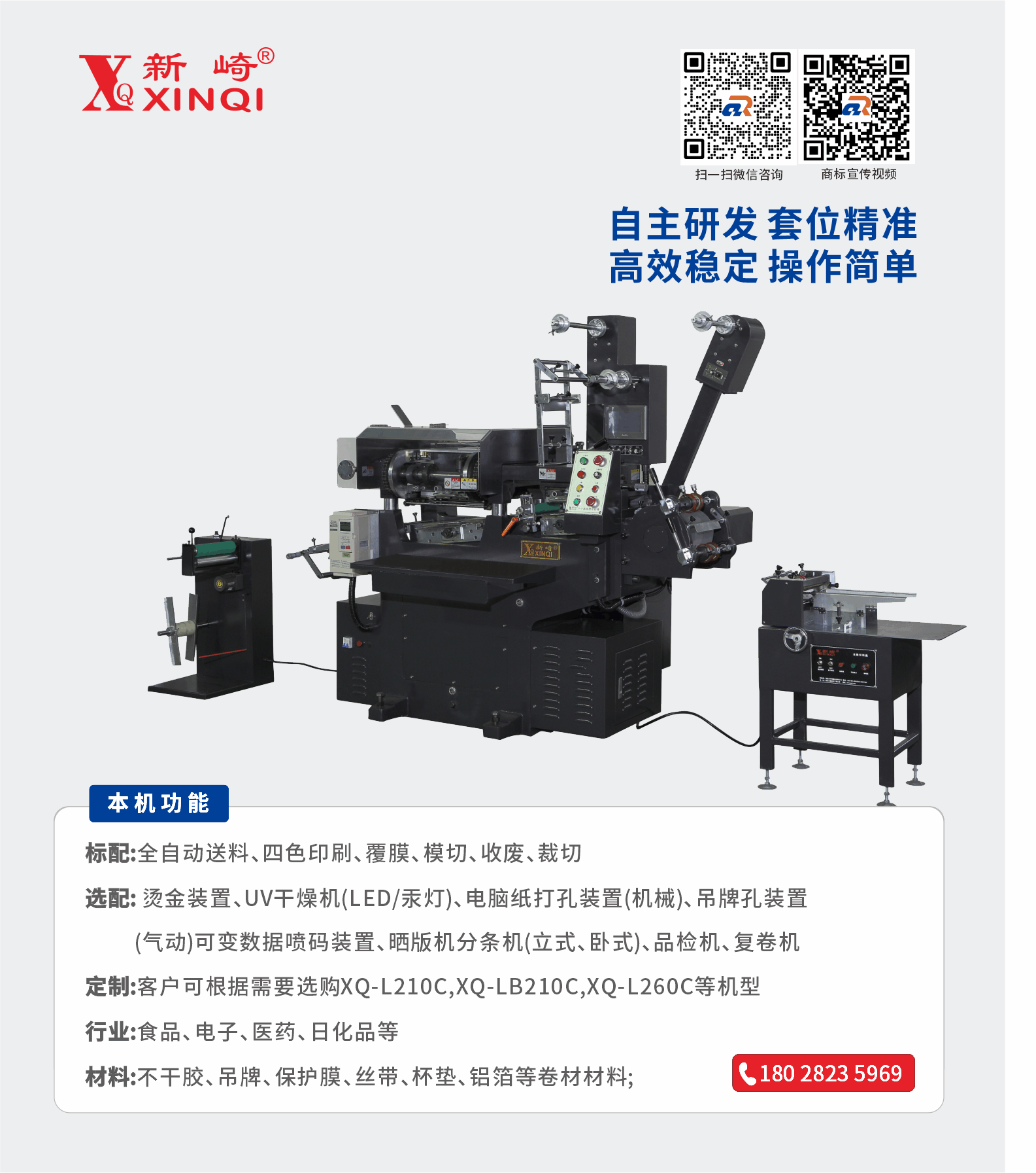 | 自動送紙、印刷、覆膜、模切、收廢、裁切。 |