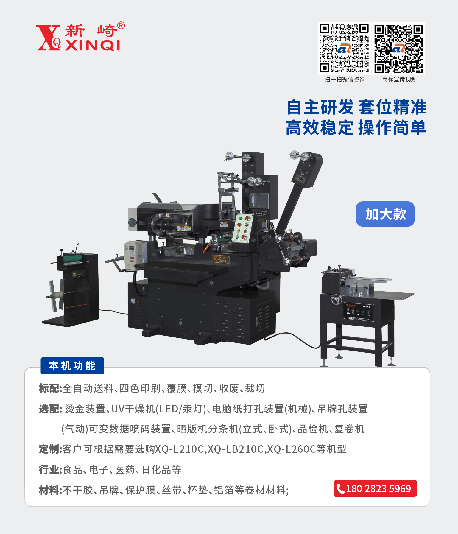 新崎XQ-LB210C商標印刷機簡介;自動送紙-印刷-復膜-模切-(燙金)-(打孔)-排廢-裁切或復卷,勻墨方式,操作簡便、高速靈活、套位精確。